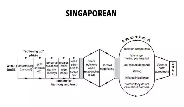 新加坡人:喜欢先跟客户打好关系,比如一起去打高尔夫,聊一些家庭问题等来建立双方的信任,然后当确认关系ok时开始谈判。他们谈判中会提到客户的竞争对手,会暗示客户要求无法达到,或者表现出他们丝毫不介意丢掉这一单,直到双方达成一致。