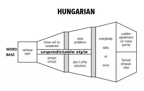 匈牙利人:行事“飘忽”,通常会给客户合作的意愿,但又有所保留,会提出问题不想解决办法。直到最后才会给客户答复,非常精明。