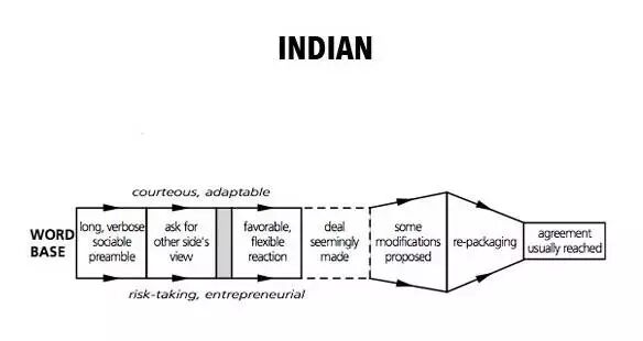 印度人:不直接切入正题,绕个大圈子后询问客户的意见并给出“官方回应”,达成初期协定后再继续重新提出方案计划。