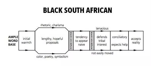 南非人:热情,喜欢提出冗长的提案,谈判过程中对自己的利益寸步不让,使用“怀柔”政策,直到对方同意自己的要求。